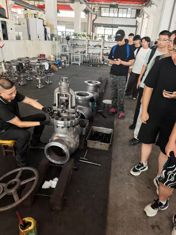 在大型阀门加工组装车间,朱厂长结合生产现场的设备与工件,详细讲解了阀门从原材料加工到零部件组装的全流程工艺,重点介绍了不同类型阀门的结构特点、性能要求及应用场景。新生们认真聆听讲解,不时围绕加工精度控制、组装流程优化等问题与朱厂长、专业教师展开交流。