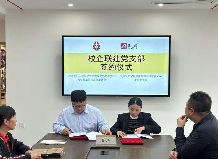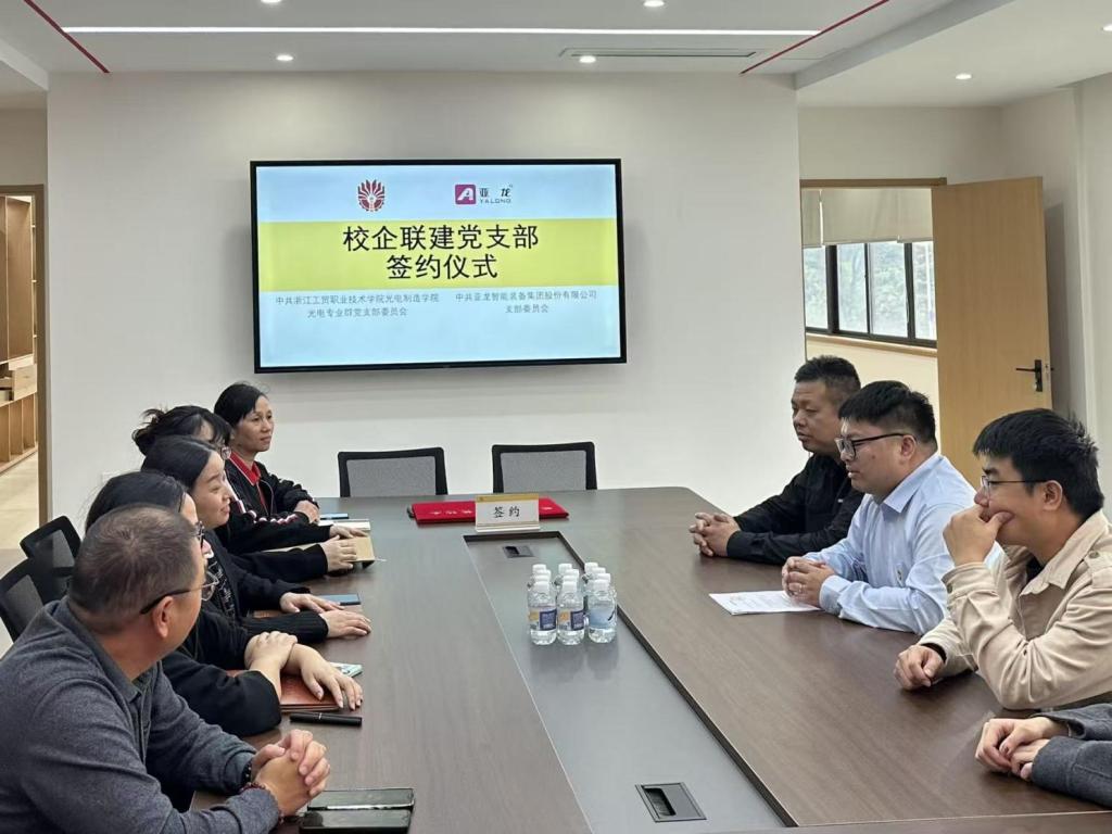 为深入贯彻落实新时代党的建设总要求,创新基层党建工作载体,提升党建工作水平,以高质量党建引领事业高质量发展,2025年11月5日,中共浙江工贸职业技术学院光电制造学院光电专业群党支部委员会与中共亚龙智能装备集团股份有限公司支部委员会在亚龙集团隆重举行校企联建党支部签约暨揭牌仪式。光电制造学院副院长、专业群党支部书记金露凡,工业机器人技术专业主任潘康俊,亚龙集团支部书记张国志,双方党支部党员代表及部分业务骨干出席了仪式。