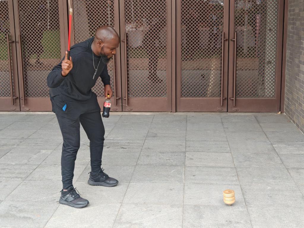 室外活动区备好传统的木质陀螺,金明磊同孔子课堂教师一起耐心指导南非嘉宾调整抽鞭力度与角度,从屡屡失误到熟练掌控,嘉宾们的成就感溢于言表,欢声笑语中尽显文化互动的活力。在传统技艺教学中注重动手实践与互动体验,也体现了浙江工贸在推动“文化+技能”融合传播方面的教育智慧与国际视野。