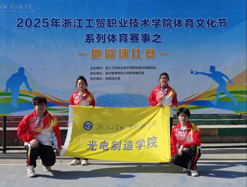 025年12月6日,浙江工贸职业技术学院体育文化节地掷球项目在瓯江口校区顺利开赛。本次赛事由浙江工贸职业技术学院体育运动委员会主办,现代管理学院公共体育教研室承办,地掷球社团协办,经过热烈的角逐,我院地掷球小队张哲启、王钟瑞、徐芹、蔡文静四人以自身丰富的经验和精湛的技艺,斩获比赛冠军,展现了我院学员拼搏进取的竞技精神和团结协作的团队素养。