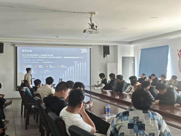 宣讲会上,大华股份人事经理张秀格系统介绍了企业发展历程、全球业务布局及行业领先优势。作为全球智慧物联领域的头部企业,大华股份业务覆盖180多个国家和地区,市场占有率稳居前列。她重点解读了大华智联高端制造产业基地与现代化物流中心的建设情况,帮助同学们全面认知企业实力与发展前景。